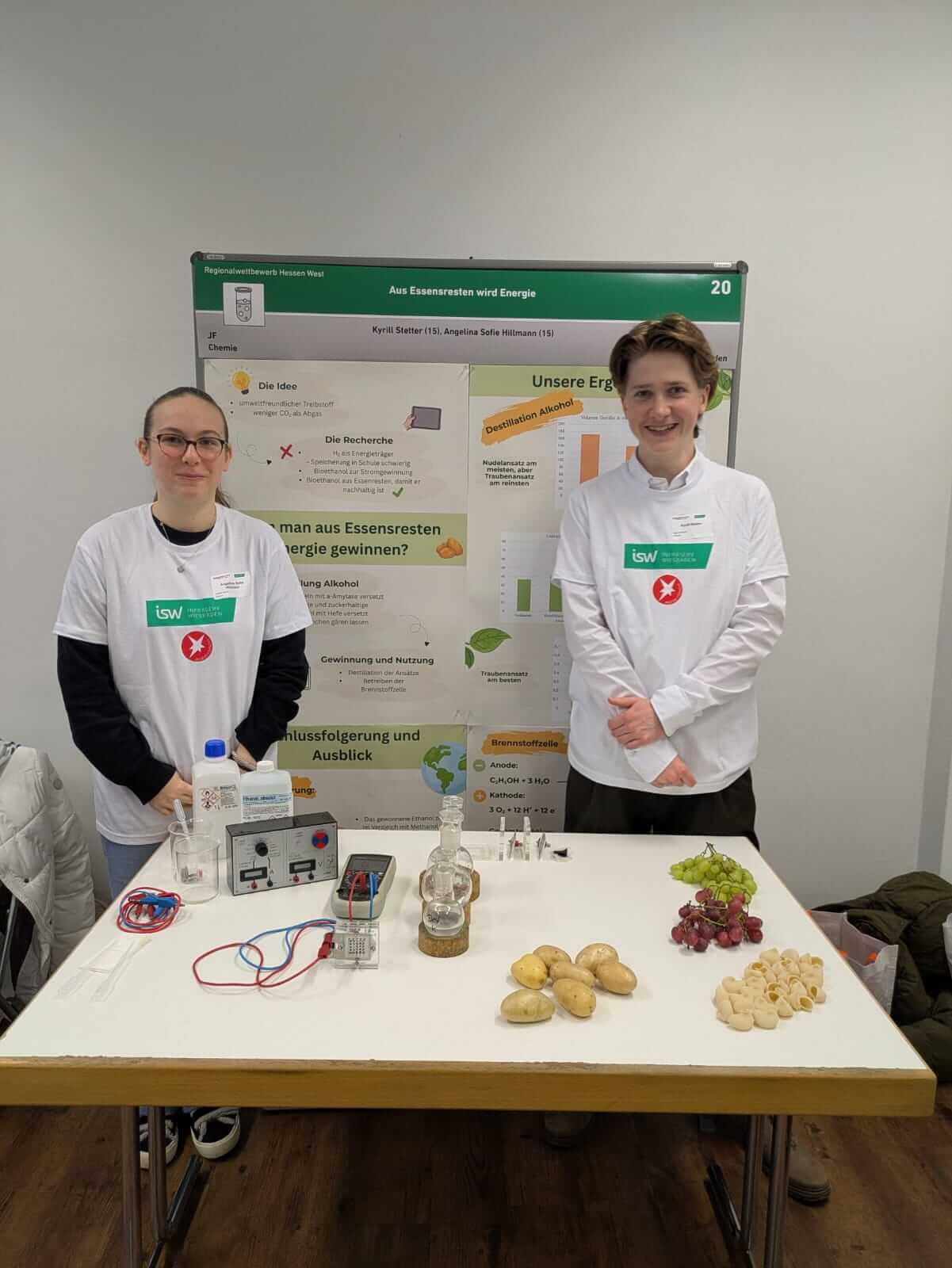 Vergangenen Samstag haben Angelina Hillmann (10e) und Kyrill Stetter (9a) mit ihrem Projekt „Aus Essensresten wird Energie“ an der Regionalrunde Hessen West von Jugend forscht mitgemacht. Über Monate hinweg haben die beiden im Rahmen der Chemie AG bei Frau Streit untersucht, ob man aus Essensresten Energie gewinnen kann – und inwiefern es Unterschiede zwischen stärke- und zuckerhaltigen Lebensmitteln gibt. Ihre Ergebnisse präsentierten sie am Samstag dann vor einer Fachjury. Nach der intensiven Befragung standen die beiden Jungforscher mit ihrem Stand der Öffentlichkeit zur Verfügung und haben die Fragen des Publikums beantwortet. In der Kategorie „Chemie“ erhielten die beiden im Rahmen einer Preisverleihung den wohlverdienten 2. Preis. Wir gratulieren herzlich zu diesem tollen Ergebnis und freuen uns, so motivierte und talentierte Schüler an unserer Schule zu haben!